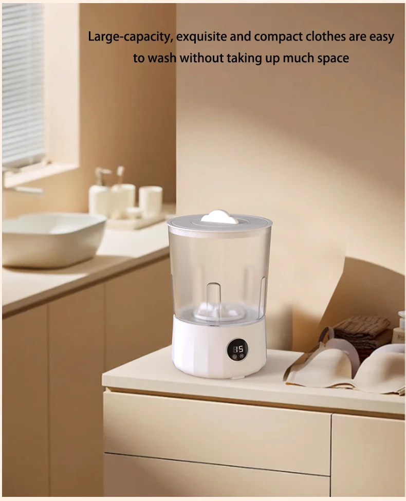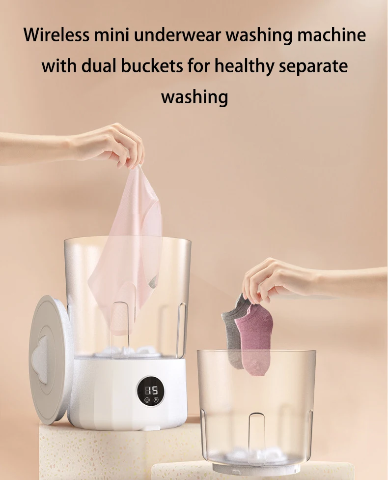 A compact, rechargeable mini washing device designed to clean your underwear, socks, and even your child’s small clothes — effortlessly, quietly, and privately.